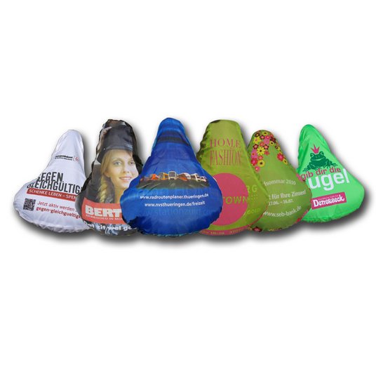 Sie wollen auch individuell bedruckte Sattelüberzüge? Lerche: Werbemittel ist Ihr Partner für Werbung rund ums Fahrrad!