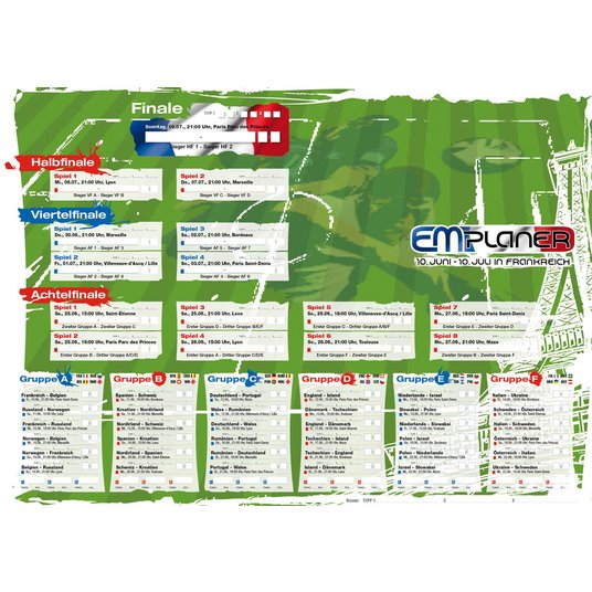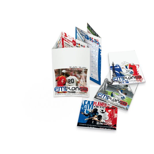 Lerche:, Spezialist und Hersteller von Fanartikel und Merchandising, bietet im Bereich EM Planer für jeden Geschmack etwas an: Großformatige Wandplaner in A1 oder A2 individuell bedruckt, informative EM Broschüren mit Ihrer Werbung und allen Spielterminen oder kleine Faltplaner für die Hosentasche mit allen Paarungen und Anstoßzeiten.