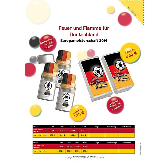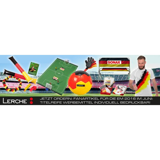 Lerche: Ihr Spezialist für Fanartikel und Merchandising zur EM 2016 hilft Ihnen dabei, das passende Werbegeschenk für Ihr Unternehmen mit Ihrem Logo bedruckt zu finden! Wir sind spezialisiert auf Werbemittel, die sich von der Masse abheben und aufgrund ihres hohen Gebrauchswerts und Nutzen eine lange und nachhaltige Werbedauer besitzen.