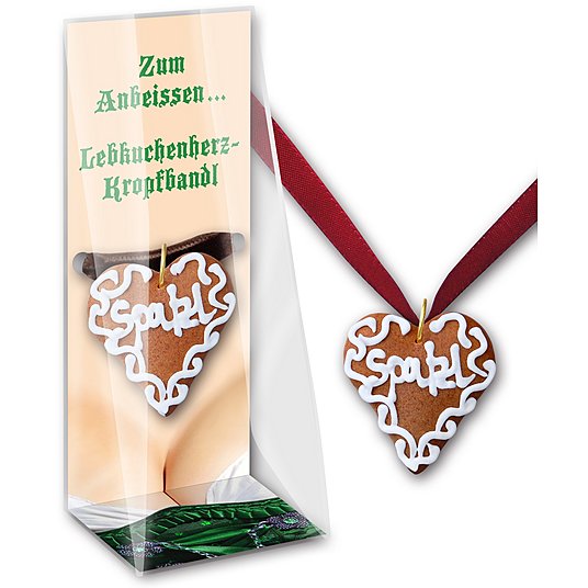 Mit diesem Werbeartikel stechen Sie auf dem Münchner Oktoberfest 2015 hervor! Diese Halskette mit Lebkuchen-Herz aus feinstem Honiglebkuchen ist ein witziges essbares Werbemittel, passend zu Dirndl, Lederhosen und Co. in seiner charmanten Herzform und originell als Halskette als Wiesn-Must-have 2015! In der Größe 4,5 x 4,5 cm kommt diese Halskette mit Lebkuchenherz mit braunem stilvollem Samtband ganz traditionell daher. Das handbeschriftete Lebkuchenherz wird mittels Metallring an der Kette befestigt. Verpackt im Glanzbeutel auf einer bedruckten Karte. Bei diesem essbarem Werbemittel ist die Karte mit Ihrem persönlichem Firmen-Logo oder Schriftzug 4-farbig bedruckbar. Sie möchten statt der Karte lieber das Lebkuchenherz beschriften? Dieses Werbemittel ist optional auch mit Ihrem individuellen Firmen-Logo aus Marzipan beschriftbar - fragen Sie nach! Durch nur 6 g Gewicht lässt sich die Lebkuchenherz Kette locker um den Hals tragen! Dieser essbare süße Werbeartikel zur Wiesn besteht aus hochwertigem feinsten Honiglebkuchen, der von Hand mit Zuckerguss verziert wird. Ein witziges essbares Werbegeschenk zum Thema Wiesn und Oktoberfest 2015 und für alle Branchen geeignet und ein toller Werbeartikel passend zu vielen Events während der Oktoberfest Saison! Weitere Lebkuchen Artikel zum Thema Oktoberfest und Wiesen 2015 finden Sie auch hier.