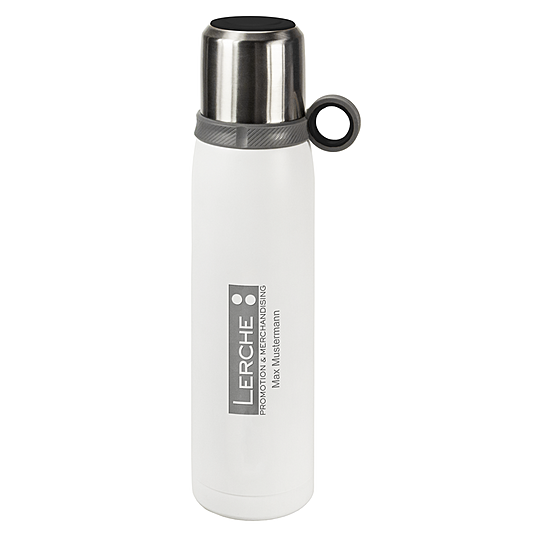 Sie suchen nach einem hochwertigen und zugleich praktischen Werbeartikel für Ihr Unternehmen? Dann setzen Sie auf diese edle Vakuum Kanne mit integriertem Becher! Diese doppelwandige Thermoskanne aus robustem Edelstahl und Kunststoff kann individuell nach Ihren Vorstellungen mit eigenem Logo bedruckt oder graviert werden. Sie kann 600 ml an Flüssigkeiten aufnehmen und ist sogar unterwegs einsetzbar. Durch den integrierten Becher können Sie jederzeit Ihren Kaffee genießen. Mit Doppelfunktion als Becher und Deckel. Die Vakuum Kanne im weiß-silbernen Design mit einer Höhe von ca. 285 mm und einem Durchmesser von ca. 73 mm ist schon ab einer kleinen Stückzahl von nur 48 Stück verfügbar.