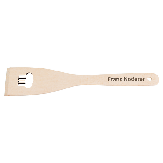 Dieser auffällige Pfannenwender fällt sofort durch sein außergewöhnliches Design auf. Der Kopf und der Griff können ganz individuell mit einem Laserschnitt versehen werden. Ihr Motiv ausgeschnitten auf diesem auffälligen Pfannenwender. Auch eine persönliche Lasergravur mit Ihrem Unternehmenslogo kann hier realisiert werden. Der nützliche Küchenhelfer made in Germany eignet sich ideal als Werbegeschenk in der Gastronomie- oder Hotelleriebranche. Aber auch im Tourismusbereich ein begehrtes Give-Away. Wie wäre es für Ihren Einzelhandel- oder Lebensunternehmen mit diesen Pfannenwender mit Lasergravur? Als Werbegeschenk lässt sich gegen Aufpreis auch eine Individualisierung mit Einzelnamen umsetzen.