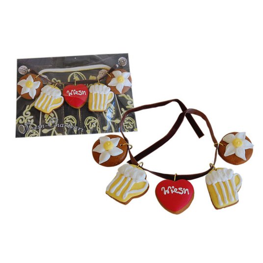 Individuell verzierte Lebkuchen-Charivari passend zum Oktoberfest 2015 - verschenken Sie den bayerischen Werbeartikel zur Wiesn-Zeit. Ideal als süße Werbung oder als Souvenir mit Wiedererkennungseffekt. Die liebevoll verzierten Lebkuchen-Anhänger sind als Kette auf individuell bedruckten Karten befestigt, die in zwei Größen erhältlich sind: klein 5 x 5 cm, groß: 21 x 15,5 cm. Liebevoll per Hand verziert ab 50 Stück erhältlich sind die Lebkuchen-Anhänger in verschiedenen Formen wie z.B. Masskrüge oder Herzen an einem Band in Lederoptik auf die Karte gefädelt. Charivari bedeutet in Bayern "Kette". Die Lebkuchen-Kette ist auf eine Karte gefädelt und in Glanzfolie verpackt. Die Karte kann ab 50 Stück individuell nach Ihren Wünschen mit Ihrem Logo, Schriftzug, Slogan oder Motivwünschen bedruckt werden. Sie profitieren bei dem bayerischen Geschenkartikel von einer kurzen Lieferzeit von ca. 2-3 Wochen nach Freigabe. Für jede Branche einsetzbar - als witzige Einladung für Ihre Geschäftspartner und Kunden zum Oktoberfest 2015 oder als Streuartikel für Ihre Kunden zur Wiesn-Zeit: