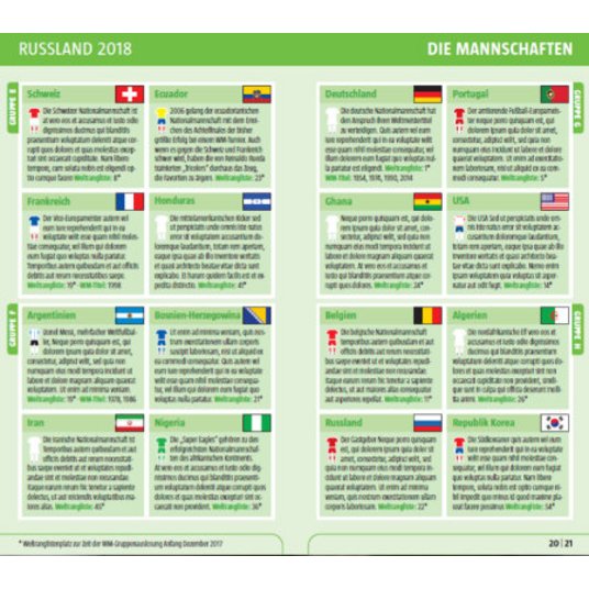 Des Weiteren sind in dem WM-Guide zu entdecken: Fakten über Städte sowie über die 32 teilnehmenden Mannschaften, deren Starspieler und Trainer, Informationen über die einzelnen Spielstadien und vieles mehr. Alles in gewohnter Qualität von Marco Polo - und nicht im Einzelhandel zu kaufen: Diese Version wird es zur Fußball-WM 2018 in Russland ausschließlich als Werbeartikel geben!