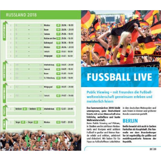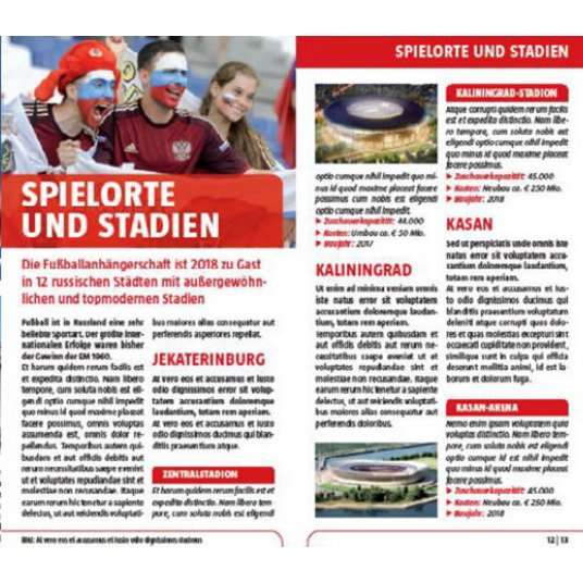 Der Info-Guide mit Spielplänen zur WM 2018 in Russland weist eine Größe von 8,5 x 15 cm auf und lässt sich großflächig und individuell auf der Vorderseite nach Ihren Wünschen gestalten. Dies macht ihn zum idealen Werbeartikel zur nächsten Fußball-WM, den Sie als Streuartikel, als Onpack oder für ein Mailing einsetzen können. Der Markenartikel ist bei Fußballfreunden sehr beliebt, denn in ihm sind alle nützlichen Informationen wie Public-Viewing-Orte und der Spielplan enthalten.