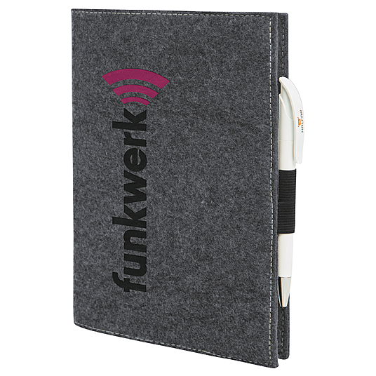 Passend hierzu strahlt die vielseitig einsetzbare Filzmappe im DIN A5 Format (auch als Variante für DIN A4 erhältlich) Hier können Ihr Schreibblock oder wichtige Dokumente und Unterlagen sicher verwahrt werden. Die ebenfalls aus Polyesterfilz bestehende Werbehülle beinhaltet zudem ein Einsteckfach für Visitenkarten, sowie eine Stiftschlaufe zum Verschließen. Mit 17x23x1cm Umfang kann sie ganz einfach in Ihrer Tasche verstaut werden. Mit großer Werbefläche, um Ihr Motiv oder persönliches Logo auffällig zur Geltung zu bringen.