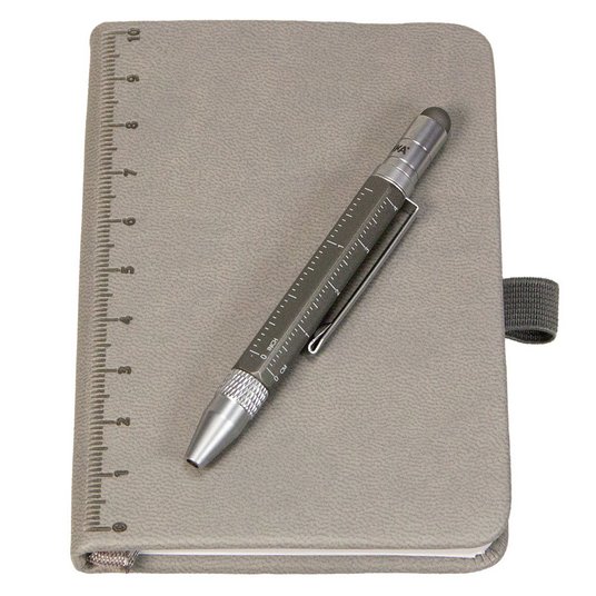 Das Notizbuch im Mini-Format hat ein 10 cm Lineal auf dem Umschlag eingeprägt. Außerdem verfügt das Büchlein über ein Lesezeichen, einen Elastikband-Verschluss und über eine Stiftschlaufe. In dieser Schlaufe befindet sich der Multitasking Kugelschreiber ebenfalls im Mini-Format. Er kombiniert Zentimeter- und Zoll-Lineal, Schlitz- und Kreuzschraubendreher und einen Touchpen in einem Kugelschreiber. Das Notizbuch und der Kugelschreiber sind in den Farben rot, gelb, blau, grau und schwarz erhältlich.