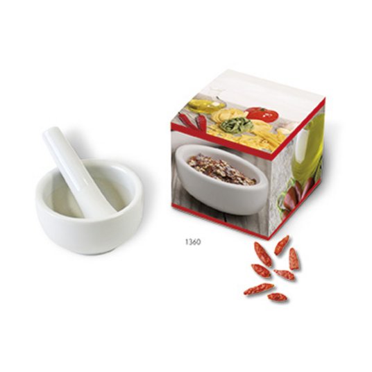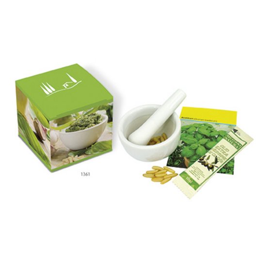 Bedruckter Präsentkarton mit Mini-Mörser aus Porzellan und Zubehör für frisches Pesto zum selber zubereiten. Neu und innovativ: Geschenksets mit Mini-Mörser und Mini-Stößel zum feinen Zerreiben von Kräutern und Gewürzen. Hier entwickeln sich feinste Aromen für die aromatische Küche: Mit dem Präsentkarton Mini-Mörser Hot erhalten Sie den genannten Porzellan-Mini-Mörser mit dem passenden Stößel, 3 g getrocknete Chili-Schoten im Beutel sowie 10 ml italienisches Olivenöl - die kulinarische Würzpaste für alle, die es gerne etwas schärfer mögen. Das Gewürzset finden Sie als Werbemittel im individuell bedruckten Präsentkarton. Weiteres Extra ist das auf dem Karton aufgedruckte Rezept. Mit dem Werbemittel Mini-Mörser Mediterran im bedruckten Präsentkarton zaubert man leckerstes Basilikum-Pesto. Das Präsentset enthält einen Porzellan-Mörser mit Stößel, eine Basilikum-Samentüte,