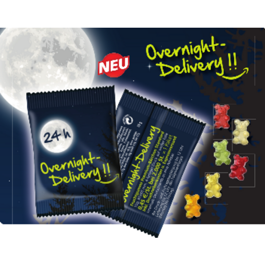Schon ab 2.000 Stück lässt sich der Streuartikel als Expresslieferung bestellen! Als Overnight ist der süße Streuartikel innerhalb von 24 Stunden nach Ihrer Druck- und Auftragsfreigabe bei Ihnen. Die Express-Gummibärchen sind die Nr. 1, wenn es darum geht, einen Last-Minute-Artikel zu finden, der Ihren Ansprüchen genügt. So steht Ihnen auch auf den letzten Drücker ein aussagekräftiger und individueller Werbeartikel zur Verfügung!