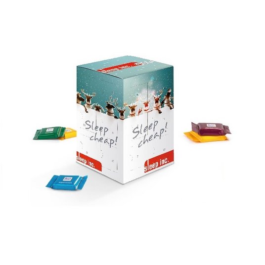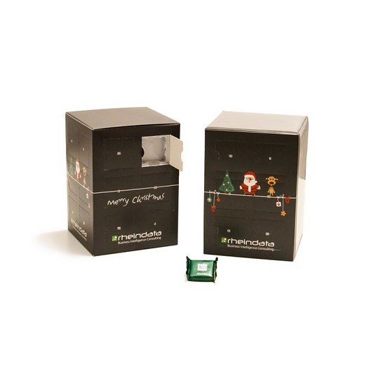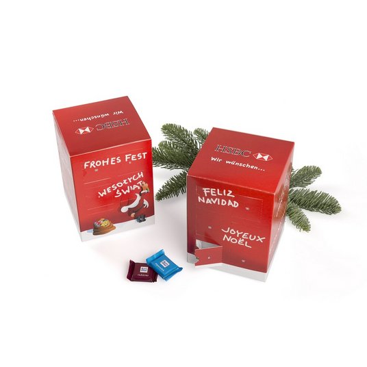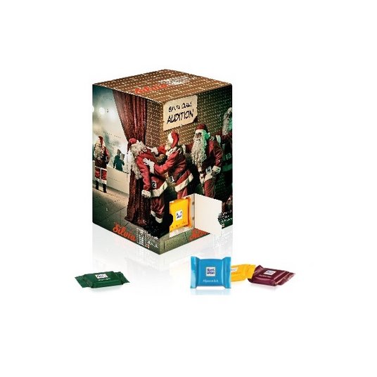 Dieser Adventskalenderturm ist rundum, auf 5 Werbeflächen, bedruckbar. Mit den Maßen 150x110x110mm überzeugt der Adventskalender mit Ihrem bedruckten Logo oder Motiv und wirbt ideal für Ihr Unternehmen. Dieser individuell bedruckbare Werbekalender ist mit 24 Ritter SPORT Schokoladen Täfelchen in den Geschmacksrichtungen Alpenmilch, Mandel, Knusperflakes und Halbbitter gefüllt.