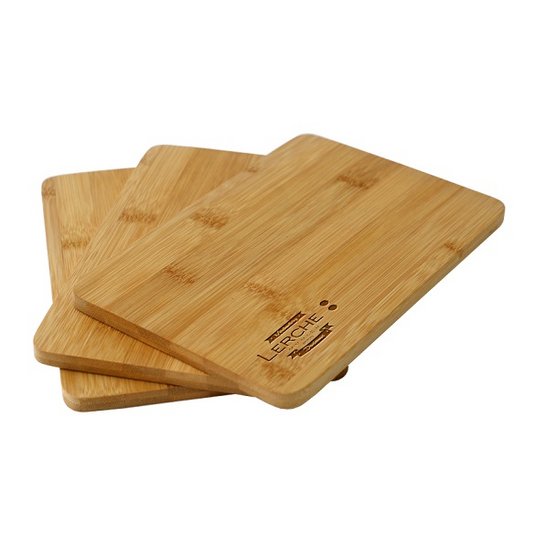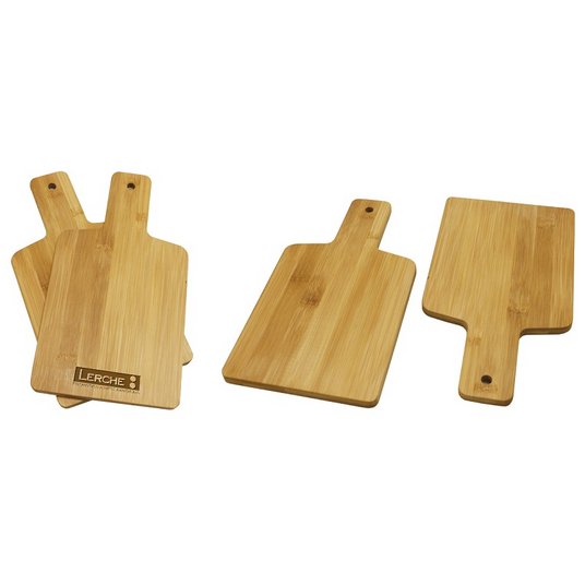 Das Schneidebrett mit Griff Artikelnr. 3333 hat die Maße 280x220x10mm. Der Preis beträgt hier bei einer Mindestbestellmenge von ebenfalls 10.000 Stück nur 1,49€. Die Bambus-Schneidebretter sind selbstverständlich sehr robust, sodass ihnen auch scharfe Messer nichts anhaben können.