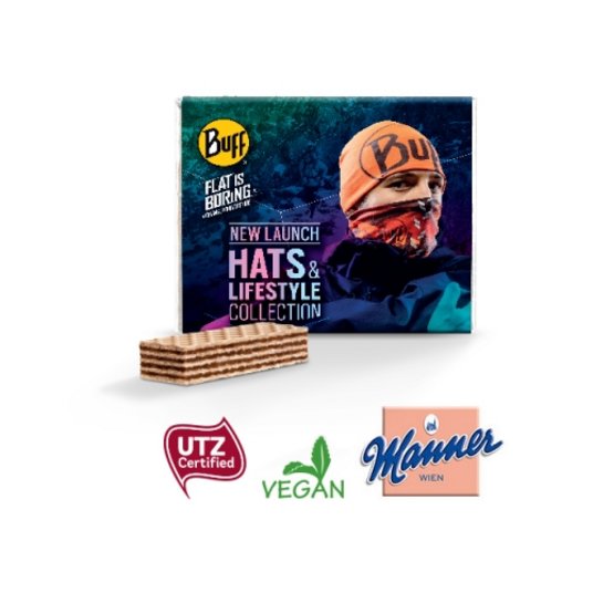 Die dritte Option ist eine Manner-Waffel in Papierbanderole, die mit Ihrem Unternehmenslogo bedruckt werden kann. Die Neapolitaner-Waffel wiegt ca. 75g und ist 5 Monate haltbar. Die Fläche für die Werbeanbringung misst ungefähr 100x85x15 mm. Geliefert werden die Haselnusscreme-Waffeln ca. 10-15 Arbeitstage nach Freigabe.