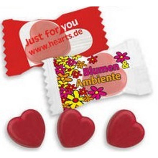 Süßes Werbemittel, Fruchtgummi in Herzform. Diese Werbemittel-Fruchtgummi sind das ideale Werbegeschenk - nicht nur als Dankeschön zu Festtagen, wie Valentinstag, Ostern, Muttertag oder zu Weihnachten, sondern auch für zwischendurch als sympathischer Abgabeartikel für Ihre Kunden. Erhältlich sind diese pfiffigen Werbe-Fruchtgummi-Herzen im Standbeutel (Inhalt: 100 g), im Flowpack oder im Tütchen (Inhalt: 10 g) verpackt, welche Sie mit Ihrer Werbebotschaft individuell bedrucken können. Sie können dieses süße Werbeprodukt mit Herz als Abgabeartikel, oder als Werbegeschenk in nahezu jeder Branche einsetzen. Auch bei Messen als kleine, süße Nascherei als Give-away bestens einzusetzen, da Sie damit garantiert den Geschmack Ihrer potentiellen Kunden treffen und diese Ihre Unternehmen in guter, herzlicher Erinnerung behalten.