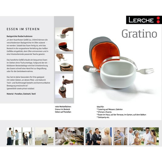 Bedruckte Suppentasse aus Porzellan, raffiniert kombiniert mit gebogenem Löffel und Gabel als Essbesteck in der Halterung. Das Design der hochwertigen Suppentasse stammt von Andrea Sosinski (Nimtschke Design). Dieses formschöne Suppen-Schälchen aus Porzellan mit einklickbarer Besteckablage ist die ideale Lösung für Ihr Catering auf Messen und Galerien, für Indoor-Stehparties sowie für Veranstaltungen auf der Terrasse, im Garten oder auf dem Balkon. Optimal ist dieses feuerfeste Gefäß mit einem Fassungsvermögen von ca. 250 ml für verschiedenste Backgerichte zu verwenden, die Sie im Ofen zubereiten. Ist das Essen fertig, wird das Besteck in die vorhergesehene Vertiefung des Gefäßes eingeklickt, dem Ofen entnommen und in eine passende hitzeisolierende Tasche gesetzt. Oder bieten Sie Ihren Gästen doch einmal eine Suppe-to-go an! Mit Gratino können Sie bequem Ihr Essen im Stehen genießen. Brauchen Sie schnell eine freie Hand, um jemanden zu begrüßen oder etwas zu trinken, so können Sie das Besteck an der Schale anklinken, welches dann als Henkel zum Halten dient. Auf dem Besteck und der Schale steht Ihnen eine riesige Werbefläche zur Verfügung. So können Sie eine Gravur am Besteck sowie ein Dekor auf Porzellan anbringen und Ihr Logo findet gestochen scharf die Aufmerksamkeit Ihrer Gäste.