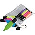 Eine Alternative zu den Ständern sind die Textmarker im durchsichtigen Täschchen. Auf dem Beutel oberhalb der Textmarker kann Ihr Logo aufgedruckt werden. Das Textmarkerset hat an dem Täschchen ein Befestigungskettchen, um es leicht zu verstauen und aufzuhängen, wenn man den Arbeitsbereich bestmöglich ausnutzen möchte. Das Täschchen ist 9 x 9,5 x 1,8 cm groß und lässt sich auf einer Fläche von 5 x 1,5 cm per Druck veredeln.