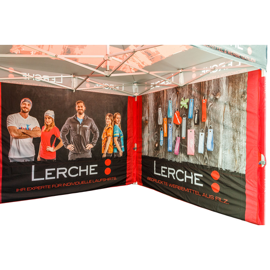 Problemlos aufbaubar: Erst Rahmen ausziehen und in die richtige Position bringen, anschließend nur noch die Wände mit praktischen Klettverschluss hinzufügen. Sie können dieses robuste Zelt auch mit weiteren bedruckten Zelten verbinden und kombinieren. Unsere Lerche: und Wuiderer Zelte strahlen mit auffälligen und vollflächigen Sublimationsdruck. Im schwarzen und roten Design stechen Sie überall sofort heraus.
