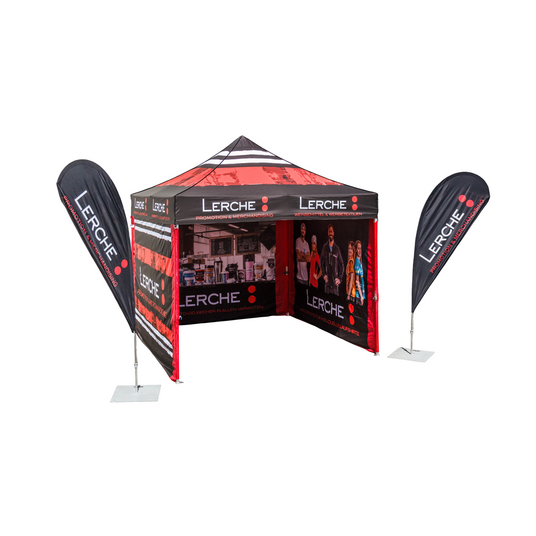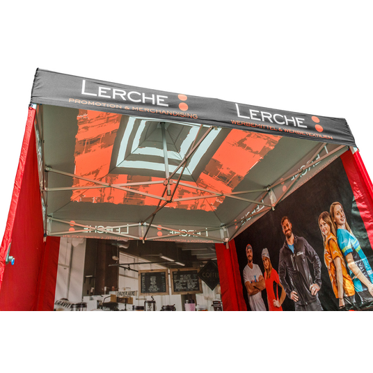Es eignet sich hervorragend für alle Arten von Veranstaltungen. Von internen Firmenfeiern über Promotion Events bis hin zu großen Messeauftritten. Das moderne Werbezelt umfasst ein Format von 3x3m, kann aber in vielen weiteren Formen und Größen erworben werden. Durch den hochwertigen Sublimationsdruck kann eine hohe Druckqualität gewährleistet werden. So sehen Sie Ihr individuelles Werbemotiv vollflächig und exakt abgebildet auf Ihrem Promotion Zelt.