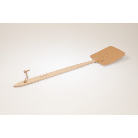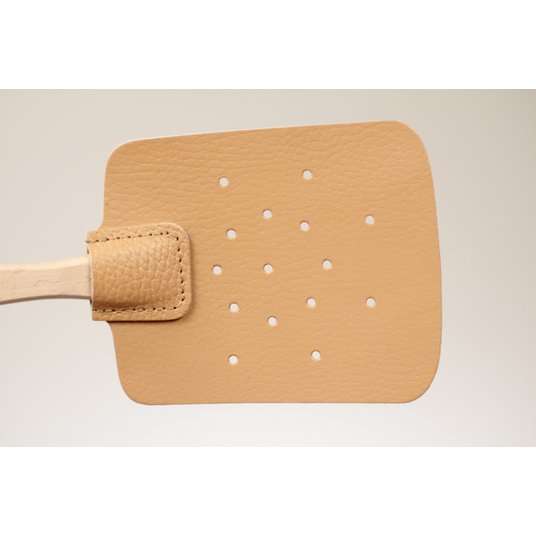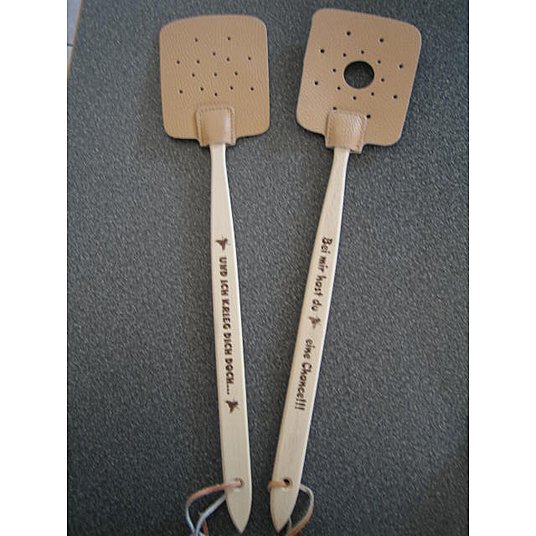 bedrucken Werbeartikel Fliegenklatsche, mit Logo oder Werbespruch per Einbrand veredelt: hier erhalten Sie ein praktisches Werbemittel für den Sommer, das zudem gut aussieht und von langer Lebens- und Nutzungsdauer ist. Die Fliegenklatsche aus Holz und Kunstleder ist ein umweltfreundliches und nachhaltiges Werbemittel mit hoher Funktionalität, denn es macht den lästigen Fliegen und Mücken im Sommer und Spätsommer schnell den Garaus. Die Fliegenklatsche als Werbemittel mit Logoeinbrand hat die Größe 46x10cm und ist mit einem praktischen Aufhängeband versehen. Das Werbemittel Fliegenklatsche aus Holz und Kunstleder ist hochwertig verarbeitet und bietet eine optisch attraktive Alternative zu den billigen Plastik-Fliegenklatschen. Die Fliegenklatsche mit Logo-Einbrand ist ein günstiges, gebräuchliches Werbemittel, das prima als Give-away im Handel oder auf Messen eingesetzt werden kann, gerade auf Freizeit- oder Urlaubsmessen kommt das nachhaltige Werbemittel sicher gut an.
