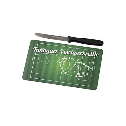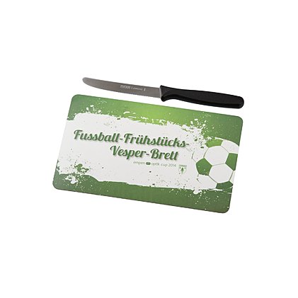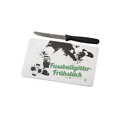 Bedruckte Frühstücksbrettchen, Made in Germany, aus wasserfesten, hitzebeständigen und säurefesten Resopal Material. Die preiswerten Kunststoffbrettchen mit Werbung vollflächig bedruckt sind in der Größe von 23,3 x 14,3 cm superleicht mit nur 2 mm Stärke. Die hochwertige 4-Farb-Bedruckung ist spülmaschinenfest. Die Hochglanz-Oberfläche gibt dem Werbedruck mehr Farb- und Leuchtkraft. Die Rückseite des bedruckten Werbe-Frühstückbrettchens ist mit einer neutralen Leinenstruktur gestaltet. Ab der Stückzahl von 300 sind vier Motive, ab 500 Stück acht verschiedenen Bildmotive in Fotoqualität möglich. Mindestmenge sind 100 Stück und die Liefezeit hierzu beträgt zwischen 5 und 7 Wochen nach Druckfreigabe. Clever und witzig ist die Idee verschiedene Motive einer Werbe-Kampagne auf mehrere Frühstücksbrettern zu verteilen. Im Auftrag der Lorth Gessler Mittelstädt GmbH wurde für die Kampagne „empen optik cup 2014“ grafisch originelle Fußballmotive entwickelt. Zum Beispiel das Brettchen für den Hunger, das für die Spielstrategie und eines für die Kondition.