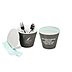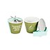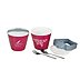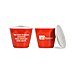 Der hellgraue Kunststoffdeckel ist auslaufsicher, die Silikonbanderole ist in den Farben weiß, gelb, rosa, hellblau, dunkelblau, mint, grau-blau, rot und schwarz verfügbar. Sonderfarben z.B. nach Pantone sind gegen Aufpreis ab einer Bestellmenge von 500 Stück möglich. Die Snack2Go-Schale mit Besteckset ist mit einer Bodenmarke versehen.