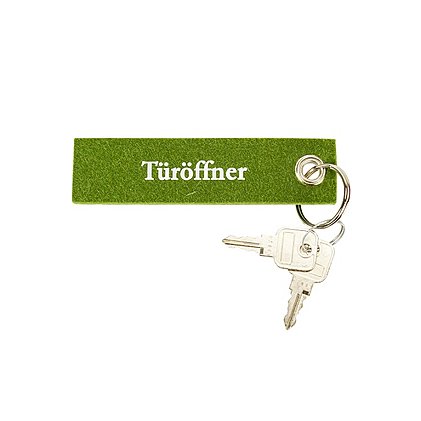 Unser Kunde, die Seniorenresidenz Augustinum, hat sich für die Schlüsselanhänger aus Filz in olivgrün als Werbemittel entschieden. Auf der Vorderseite des Anhängers wurde das Logo und der Name der Seniorenresidenz einfarbig mit einer Mindeststrichstärke von 0,5 mm in weiß via Siebdruck gedruckt, während auf der Rückseite „Türöffner“ zu lesen ist.