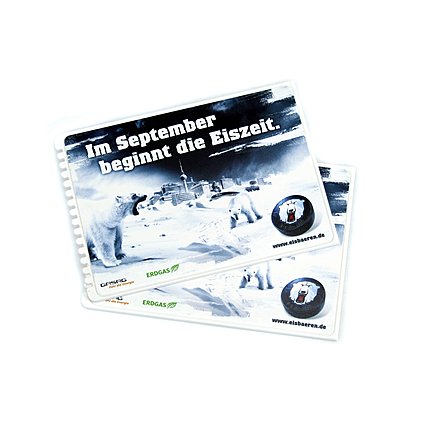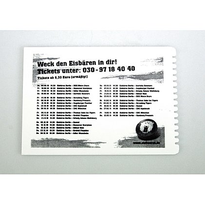 Eiskratzer mit Werbedruck - die Eishockeymannschaft Eisbären Berlin DEL hat den Eiskratzer im Postkartenformat als Werbemittel und Infoträger genutzt und ihre Spieltermine der neuen Saison darauf drucken lassen. So wird effektiv der Ticketverkauf angekurbelt. Ein Werbeträger mit Zusatznutzen! Die weiße Kunststoff-Postkarte wurde im InMould-Verfahren beidseitig bedruckt. Ein toller Streuartikel für die Herbstzeit und Wintersaison. Bringen Sie Ihre Werbebotschaft und wichtige Termine effektvoll an Ihre Werbezielgruppe.