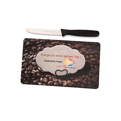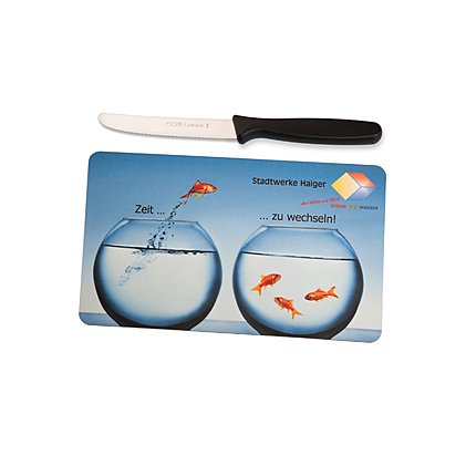 Resopal Schneidebrett oder Frühstücksbrett vollflächig bedruckt, das Original Made in Germany! Frühstückbrettchen bedruckt mit eigenem Motiv sind als Werbeartikel sehr beliebt und vielseitig einsetzbar. Für Motivserien, mit witzigen Werbesprüchen oder lustigen Comic-Motiven haben sie Kultfaktor. Auch die Stadtwerke Haiger haben sich von uns eine Motivserie realisieren lassen. Wir haben verschiedene Werbemotive mittels 4-farbigen Digitaldruck realisiert, der beinahe schon 3-dimensionale Wirkung hat. Die praktischen Resopal-Schneidebrettchen kommen täglich zum Einsatz, privat, beim Camping, im Job. Mit einem Frühstücksbrett aus Resopal bedruckt mit Ihrem individuellen Motiv verschenken Sie ein Werbemittel mit Zweitnutzen und nachhaltiger Werbewirkung: Das Resopal Frühstücksbrett wird in der Küche oder im Büro eingesetzt - Ihre Werbung ist somit dauernd und großflächig präsent. Frühstücksbrettchen Resopal bedruckt in der Standardgröße von 23,3 x 14,3 cm, Sondergrößen sind auf Anfrage möglich.