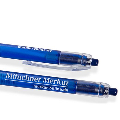 Der bedruckte Werbe-Kugelschreiber mit Firmenlogo und blauer Mine ist ein Markenprodukt von BIC, dem bekannten europäischen Hersteller für Einwegfeuerzeuge und –kugelschreiber. Sein transparent gefrostetes Kunststoffgehäuse mit der modischen Schaftform sieht gut aus und liegt schreibkonform in der Hand. In weiteren Farben, Rot, Schwarz, Weiß, Grün, Blau erhältlich. Hier können Sie die Farbe Ihren Firmenfarben anpassen. Mittels preiswertem 1-farbigem Siebdruck kann unterhalb und gegenüber des Clips das Firmenlogo und ein Werbeslogan gut sichtbar angebracht werden, wie wir für unseren Referenzkunden, dem Münchner Zeitungsverlag, realisiert haben.
