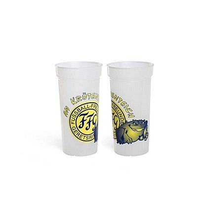 Bedruckter Trinkbecher als Werbemittel für die Fußball-Freunde Geretsried. Der transparent-milchige Pfandbecher mit einer Füllmenge von 0,5l hat die Aufschrift „Am Krötenteich“ und das Logo vom FF Geretsried als Werbedruck. Der stapelbare, bruchfeste Mehrwegbecher aus transparentem Kunststoff mit Füllmarkierung ist ein ideales Werbemittel für Sportvereine, Sportturniere und Vereinsfeiern. Aber auch passend zu Großereignissen wie die Fußball-Europameisterschaft 2016 oder anderen Veranstaltungen in den Bereichen Fußball, Handball, Eishockey, Basketball oder Tennis. Das Material des Trinkbechers ist aus Kunststoff und das individuelle Logo kann per zweifarbigen Siebdruckverfahren angebracht werden. Der bedruckte Stadionbecher entspricht der Verordnung des Europäischen Parlaments über Materialien und Gegenstände, die dazu bestimmt sind, mit Lebensmitteln in Berührung zu kommen - Made in Germany. Der individuelle Stadionbecher als Durstlöscher mit einem aufmerksamkeitsstarken Logodruck und einer Füllmenge von 0,5l istauch in anderen Liter-Versionen erhältlich, zum Beispiel 0,25l, 0,3l oder 0,4l. Günstig und schnell lieferbar! Weitere Ideen für praktische Werbeträger und Streuartikel finden Sie hier.