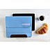 Die Maße betragen ca. 27x22,5 cm. Der weiche Filz-Stoff ist schonend zum Gehäuse und hat eine angenehme Haptik. Zusammengehalten wird das Filz-Cover von einer stabilen Kontrastnaht, die sich in gelb von dem himmelblauen Naturwollfilz absetzt, wodurch eine interessante, auffällige Optik entsteht. Besonders originell: Die Griffverstärkung aus hochwertigem, kräftigen Rindsleder in dunkelbraun! Zusätzlich verfügt die Tablet-Hülle über ein Einstecketui, ein Zusatzfach, zum Beispiel für Visitenkarten von Geschäftspartnern und wird durch eine Umschlagklappe mit Klettverschluss geschlossen.