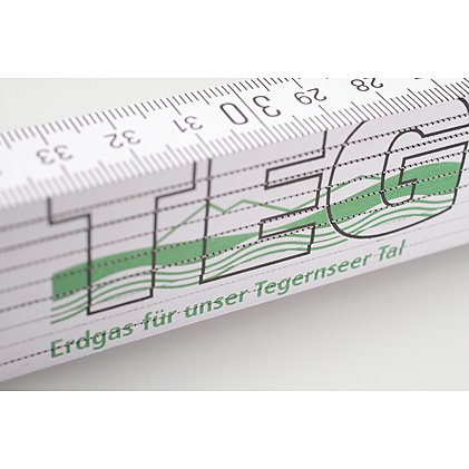 Zollstock, Holzgliedermaßstab bedruckt mit dreifarbigem Druck auf den beiden Hochseiten. Der 10-gliedrige, zwei Meter lange Maßstab aus Buchenholz mit Gelenken und innenliegenden gehärteten Stahlfedern ist ein Qualitätsprodukt mit langer Lebensdauer made in germany. Für den Unternehmensbereich Tegernseer Tal von Erdgas Südbayern wurde der Werbedruck auf weißem, matt glänzendem Holz angebracht - für spiegelfreies Ablesen. Für Ihre effektive Werbung ist außerdem ein mehrfarbiger passgenauer Druck auf den Anfangsgliedern des Maßstabs möglich. Wir bedrucken Ihnen gerne Maßstäbe, Meterstäbe, Zollstöcke aus Holz und Kunsststoff mit Ihrem Firmenlogo. Bleiben Sie jahrelang in guter Erinnerung mit einem Qualitäts-Maßstab mit Werbedruck. Eine wirkungsvolle Werbung für Industrie, Handel und Gewerbe, für Techniker, Ingenieure, Kaufleute und Privathaushalte.