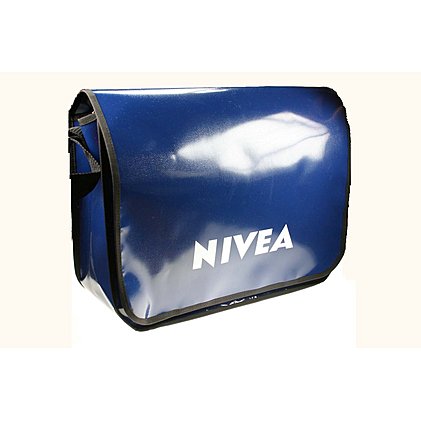 Nivea Lorrybag kultige Werbe-Umhängetasche. LKW-Planentasche in Sonderanfertigung als Werbeträger im Einsatz am Promoter. Hier als Beispiel Nivea Lorrybag® individuell gefertigt als Promoter Tasche für die Pharma-Industrie. Sie bestimmen die Farbe des Überschlags aus 37 Möglichkeiten und das Innenleben (LKW-Plane inbegriffen!) bzw. alternative Materialien zum jeweiligen Preis. Mittlerweile stehen auch individuell gefertigte Lorrybags® aus Stoff, Kaffeesack-Jute und anderen Materialien zur Verfügung. Ein toller Werbeartikel einzusetzen als Promotion-Artikel für die Pharma-Branche, aber auch für Schulen und Universitäten als individuell gestaltbare Werbemittel-Umhängetasche. Der Auftrag lief über eine Schweizer Werbeagentur, durchgeführt von Ihrem Werbemittel-Taschen Experten Lerche: GmbH südlich von München.