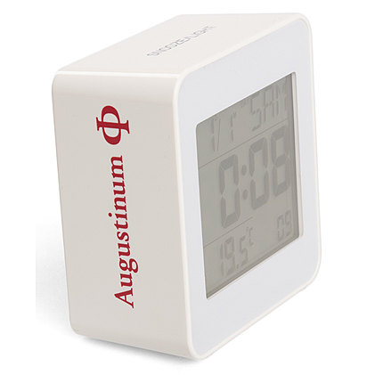 Werfen Sie einen Blick auf diesen modernen Wecker in Würfelform mit individuellem Augustinum Logo: Der weiße Wecker bietet eine große Fläche für Ihre persönliche Werbebotschaft. Der handliche Reise oder Home-Wecker besitzt viele nützliche Zusatzfunktionen: Mit integriertem Backlight, Datum- und Temperaturanzeige sowie einer funkgesteuerten Uhr. Auch eine praktische Snooze-Taste ist hier eingefügt - einfach kurz drücken und noch ein paar Minuten weiterschlafen!