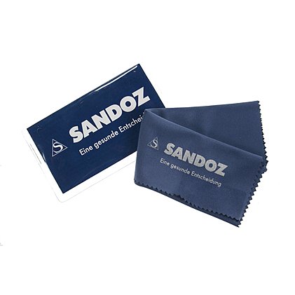 Hochwertiges Werbe-Brillenputztuch bedruckt mit Etui. Für den Werbemittelkatalog Pharma und Apotheken unseres Kunden Sandoz Deutschland haben wir dieses hochwertige Werbe-Brillenputztuch aus Microfaser produziert, welches mit bedrucktem Papiereinleger im stabilen Etui ausgeliefert wurde. Hierbei handelt es sich um ein sehr hochwertiges Brillenputztuch aus Microfaser, welches zum Beispiel auch als Werbemittel und Verkaufsartikel für Optiker der Firmen Carl Zeiss und Rodenstock eingesetzt wird. Ebenfalls kann dieses hochwertige Microfasertuch auch als bedrucktes Werbemittel für die Bildschirmreinigung, Display-Reinigung von Navigationsgeräten und Handys, sowie generell als Werbemittel für die Autoreinigung und als Staubtuch genutzt werden. Dabei können Sie Ihre individuelle Werbebotschaft großflächig auf das Tuch anbringen. Erhältlich in den Farben: schwarz, dunkelblau, silbergrau, bordeaux, orange, weiß, elfenbein. Verfügbare Größen: 10 x 15 cm, 12 x 16 cm, 15 x 18 cm. Material: optilux Premium-Qualität mit sehr hoher Dichte, optisoft easy Standard-Qualität mit mittlerer Dichte. Ideal einzusetzen als Give-Away für Ärzte, Zahnmediziner, Krankenhäuser oder Apotheken sowie Pharma-Unternehmen.