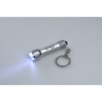 bedrucktes funktionelles Alu Schlüssellicht, das mit 5 LEDs und Schlüsselring ausgestattet ist. Damit Ihnen in jeder Situation stets das Licht aufgeht, ist die Mini-Taschenlampe Schlüsselanhänger mit der Länge von 6,7 cm und einem Durchmesser von 1,5 cm immer passend zur Stelle. Das garantiert der praktische Schlüsselring, womit Sie die LED-Lampe an Tasche oder Schlüsselbund anbringen können. Das Schlüssellicht besteht aus silberfarbenem bzw. schwarzem Metall und kann mittels Laser-Gravur oder Druck werbewirksam veredelt werden. Für Avnet wurde die matt-silberne, edel und hochwertig anmutende Variante mit dezenter Laser-Gravur gewählt. Das batteriebetriebene Schlüssellicht benötigt Knopfzellen. Das Schlüssellicht ist ein günstiges, funktionelles und praktisches Werbemittel, einsetzbar für Messen wie die Handwerksmesse oder für Freizeitmessen sowie als günstiges Werbegeschenk oder Give-away für Baumärkte oder Anbieter von Outdoor-Artikeln. Für Outdoor-Veranstaltungen oder auch im Kinder- und Jugendbereich ein nützlicher Werbeträger.