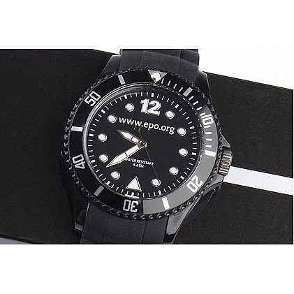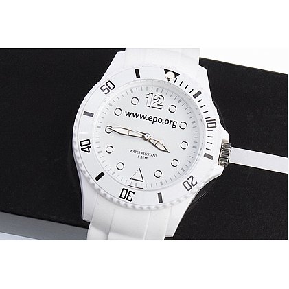 Diese 5 ATM wasserdichte Armbanduhr Modell "Lolliclock" gibt es in vielen stylischen Farben. Besonders die Modelle "Black" und "White" sind von ihrer Farbgestaltung richtig zeitgemäß. Das robuste Kunststoffgehäuse dieser bedruckbaren Sportuhr ist mit einer drehbaren Lünette versehen, die zum Beispiel bei Tauchgängen dazu dient, eine zweite Uhrzeit zu bestimmen. Die weiße Schrift auf dem schwarzen Ziffernblatt dieses bedruckbaren Werbemittels ist auch bei wenig Licht gut lesbar. Diese hochwertige bedruckbare Werbe-Armbanduhr besitzt ein softes Silikonarmband, das sich bequem und sicher um das Handgelenk legt. Mit 23 Gramm ist die bedruckbare Werbe-Sportuhr ein Leichtgewicht unter ihresgleichen. Dieses hochwertige Werbemittel zum Thema: bedruckte Promotion-Uhren, Sportuhren, Taucher-Uhren, Mode-Accessoires, ist in einer repräsentativen Kartonage verpackt, die individuell nach Ihren Wünschen mit dem Firmenlogo oder Ihrem Corporate Design bedruckt werden kann. Mit dieser sportlichen bedruckten Werbe-Armbanduhr werden Sie Ihre Geschäftspartner, Kunden oder Mitarbeiter am Messestand, auf Unternehmenspräsentationen, auf der Pressekonferenzen überraschen. Dieser elegante Zeitmesser eignet sich besonders als Werbegeschenk an Weinachten für Ihre Partner aus dem Bereich: Tauchsport, Outdoor, Freizeit, Wintersport, Bergsport. Haben wir Ihr Interesse an diversen Werbe-Uhren geweckt? Dann lassen Sie sich gerne von Lerche, dem Experten für bedruckbare Werbemittel mit Sitz in Geretsried-Gelting, im Münchner Süden beraten.