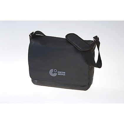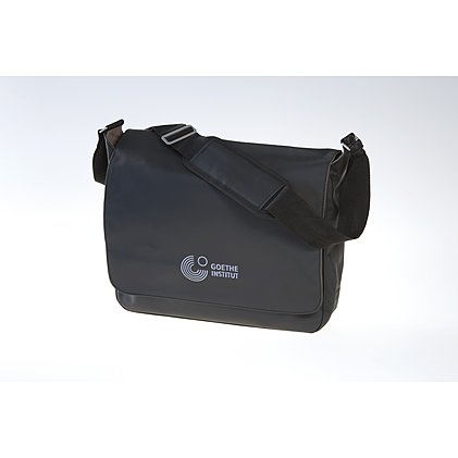 Die Laptoptasche, Seminar- und Smartbook-Tasche aus LKW-Plane ist ein besonders attraktiver Werbeträger. Für das Goethe-Institut in mattem Schwarz mit einem silberfarbenen dezenten Stick zum Werbemittel veredelt. Die Umhängetasche überzeugt durch die Ausstattung, zu der das kontrastreiche braune Baumwoll-Innenfutter, Metallschnallen, ein Hauptfach mit Organizer-Elementen und gepolstertem Notebookfach, ein bequemer Schultergurt mit Antirutsch-Schulterpolster sowie ein großer Überschlag mit Klettverschluss gehört. Die Notebook-Tasche in der Größe 37x29x13cm besitzt einen Überschlag, auf dem Sie eine Werbefläche von 25x20cm finden, auf der Fronttasche bietet sich ein 1-farbiger Siebdruck oder ein Werbestick in der 25x9cm-Größe an. Mindestmenge: 50 Stück.