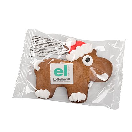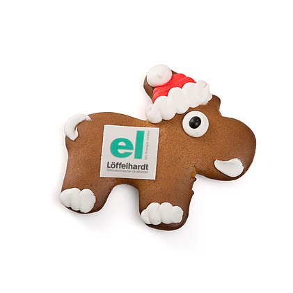 Süße Weihnachtswerbung kleiner Lebkuchenelch mit einer ganz besonderen Werbeveredelung. Das Firmenlogo ist aus Marzipan. Saftige Lebkuchenmotive zum Verschenken gehören zur Weihnachtszeit, wie der Christbaum zum Heiligabend. Der Firmenname am Beispiel der Emil Löffelhardt GmbH & Co. KG, Elektrogroßhandel aus Fellbach, wurde mittels 4-farbigem Marzipan-Fondantlogo realisiert. Das ist unwiderstehliche Werbung. Der bedruckte Lebkuchen-Elch hat eine Größe von 10 cm und ein Gewicht von 45g und ist von Hand mit Zuckerguss verziert. Der deutsche Markenhersteller Zuckersucht garantiert eine Haltbarkeit von 6 Monaten. Das süße Werbemittel Lebkuchen-Elch ist in Glanzfolie einzeln verpackt – das heißt: Sie bestellen, Sie profitieren von schnellen Lieferzeiten und setzen das bedruckte Werbemittel direkt zur Vorweihnachtszeit auf Ihrer Advents-Aktion ein.