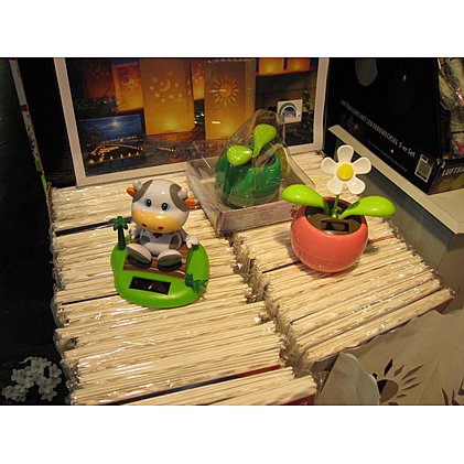 Werbemittel passend zum Thema erneuerbarer Energie. Solar-Blume bedruckt - dekorative Blume für den Schreibtisch mit Überraschungseffekt, passend zum Thema Werbemittel Solar, Nachhaltigkeit und regenerative Energie. Ausgesucht von dem Unternehmen Ingram, dem Vertreiber von Produkten der Informationstechnologie. Sind die Solarzellen der Blume der Sonne ausgesetzt, beginnen sich Blume und Blätter zu bewegen. Die Solar-Blume in den Farben Grün, Rot und Weiß entlockt sicher auch dem schwer gestressten Manager ein Lächeln. Der Spaßartikel kann mit Ihrem Werbelogo werbewirksam veredelt werden. Die niedliche Solar-Blume mit einem Durchmesser von 6,5cm und 11cm Höhe ist ein fröhliches Werbemittel, das positiv Ihre Werbebotschaft vermittelt. Sie findet auf jedem Schreibtisch einen angemessenen Platz, sieht hübsch aus und ersetzt perfekt den Blumentopf mit der echten Blume, die regelmäßig gegossen werden muss. Die Solar-Blume ist der Inbegriff von Lebensfreude und Fröhlichkeit. Ein Werbemittel, das als Geschenk für und zur Motivation von Mitarbeitern eingesetzt werden kann, das aber auch im Lifestyle-Bereich seine Berechtigung hat, beispielsweise als Werbegeschenk für Kunden von Einrichtungshäusern. Mittlerweilen auch als Kuhmodell lieferbar.